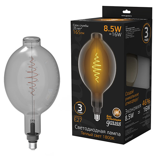 Лампа светодиодная Gauss Filament BT180 8,5W 165lm 1800К Е27 Gray Flexible LED (8,5 Вт, 165 лм, серая колба)