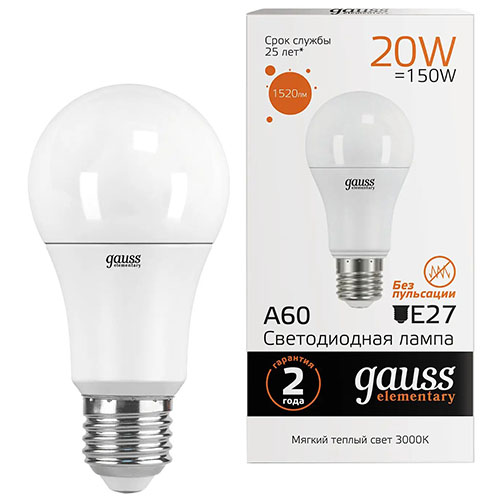 Лампа светодиодная Gauss 23219 Elementary (20 Вт, E27, А60 стандарт, 1520 лм, 3000 К)