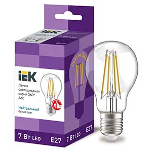 Лампа светодиодная IEK LLF-A60-7-230-40-E27-CL (A60 стандарт, E27, 7 Вт, 840 лм), прозрачная, цвет свечения нейтральный белый