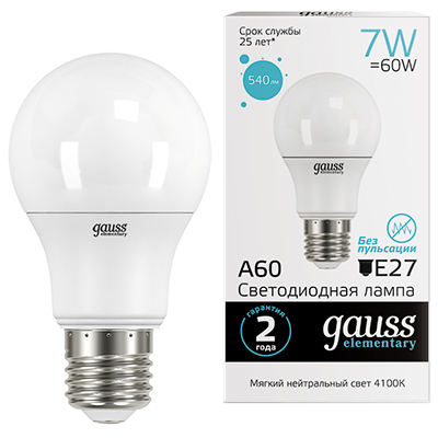 Лампа светодиодная Gauss 23227A Elementary (A60, 220 В, E27, 7 Вт, 540 лм, 4100 К)