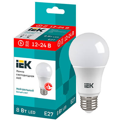Лампа светодиодная низковольтная IEK LLE-A60-08-12-24-40-E27 (A60 стандарт, 12 - 24 В, E27, 8 Вт, 760 лм), цвет свечения нейтральный белый