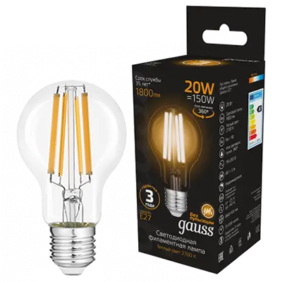 Лампа светодиодная Gauss 102902120 Black Filament (A60 стандарт, E27, 220 В, 20 Вт, 1800 лм, 2700 К, прозрачная колба)