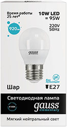 Лампа светодиодная Gauss Elementary 53220 (10 Вт, E27, G45 шар, 920 лм, 4100 К)