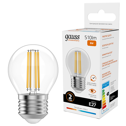 Лампа светодиодная Gauss 52218 Filament Elementary (G45 шар, Е27, 8 Вт, 510 лм, 2700 К, прозрачная колба)