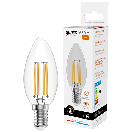 Лампа светодиодная Gauss 32110 Filament Elementary (С35 свеча, Е14, 10 Вт, 650 лм, 2700 К, прозрачная колба)