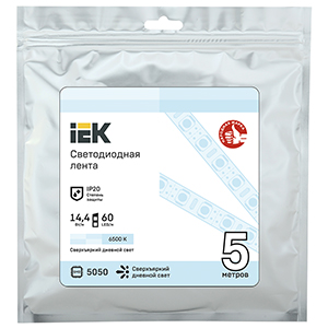 Лента светодиодная IEK LSR-5050W60-14,4-IP20-12В PRO (SMD 5050, 12 В, 14,4 Вт/м, 60 led/м, IP20), цвет свечения холодный белый
