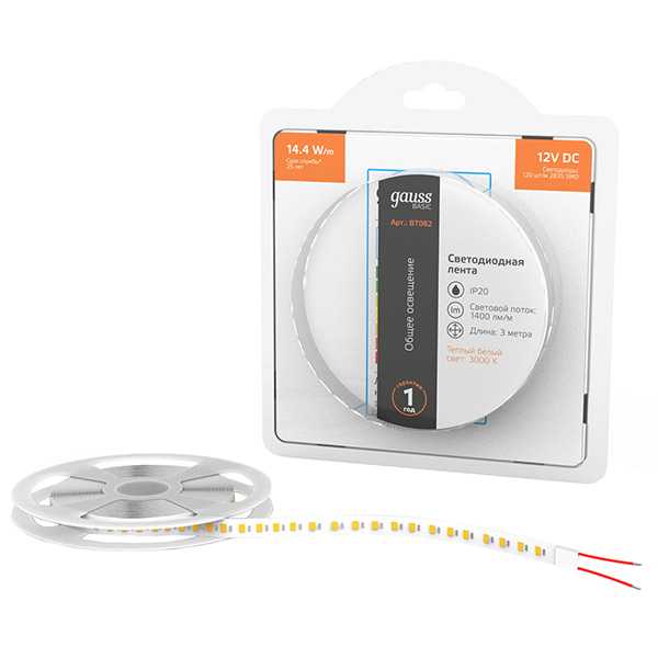 Лента светодиодная Gauss BT082 Basic (SMD2835, 12 В, 14,4 Вт/м, 120 led/м, 1400 лм/м, 3000 К, IP20), 3 м