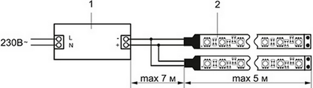 - Максимальное удаление светодиодной ленты от блока питания без потери освещенности: не более 7 м.
