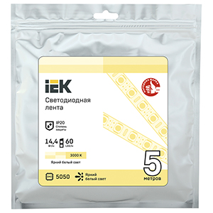 Лента светодиодная IEK LSR-5050WW60-14,4-IP20-12В PRO (SMD 5050, 12 В, 14,4 Вт/м, 60 led/м, IP20), цвет свечения теплый белый
