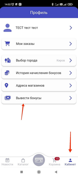 1. В мобильном приложении зайти во вкладку «Кабинет», выбрать «Вывести бонусы».
